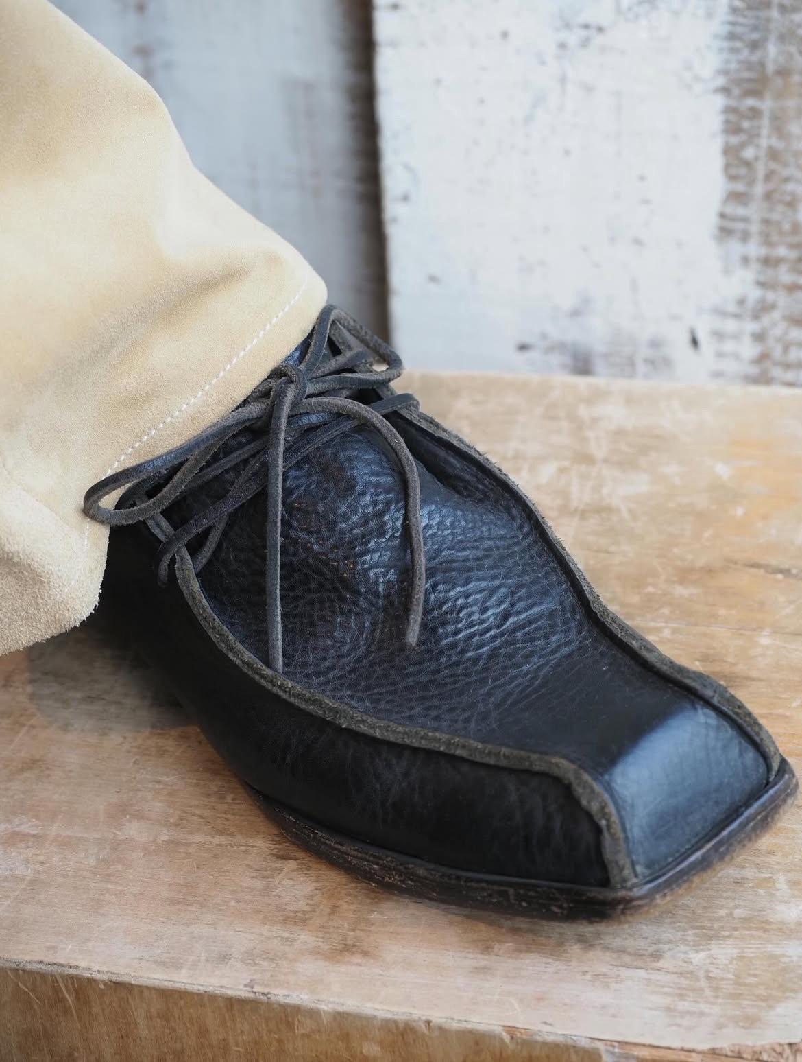 スクエアトゥでアッパーをU字に縫い合わせたモカシンのような構造