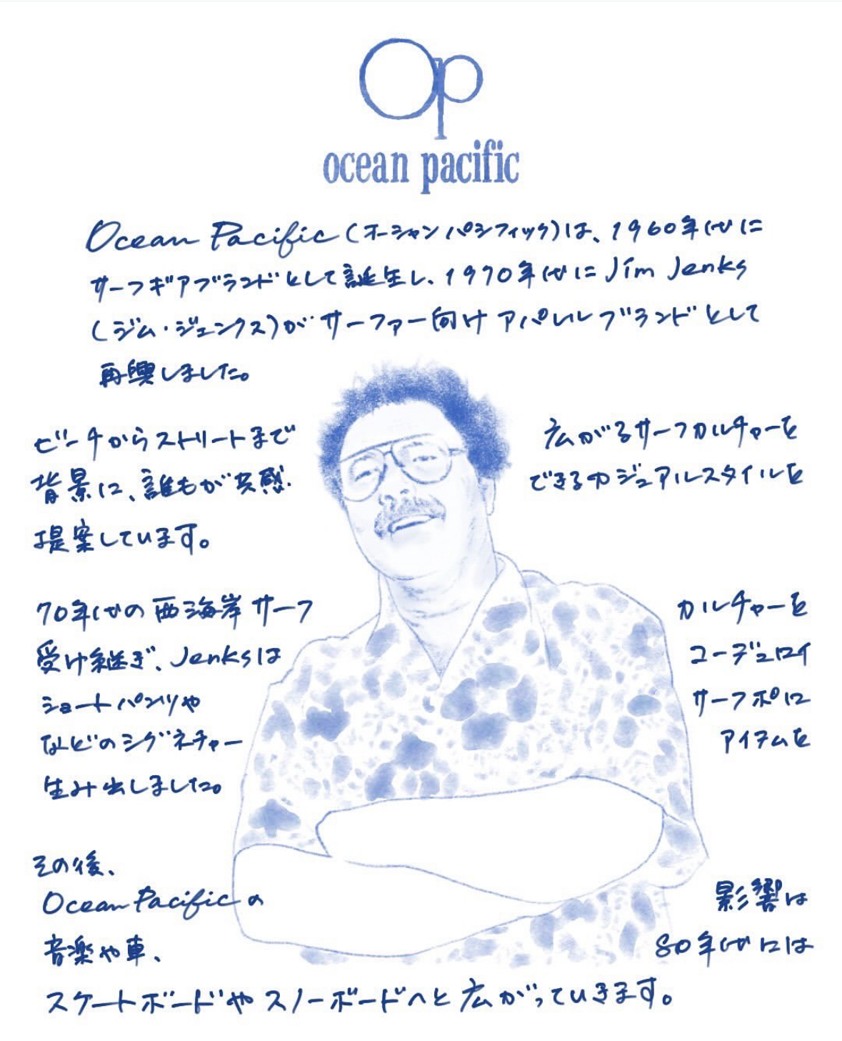 まずは Ocean Pacific(オーシャンパシフィック) についてですが、1階店長の末吉さんが絵日記で分かりやすく紹介してくれているので、ぜひそちらもご覧ください m(_ _)m