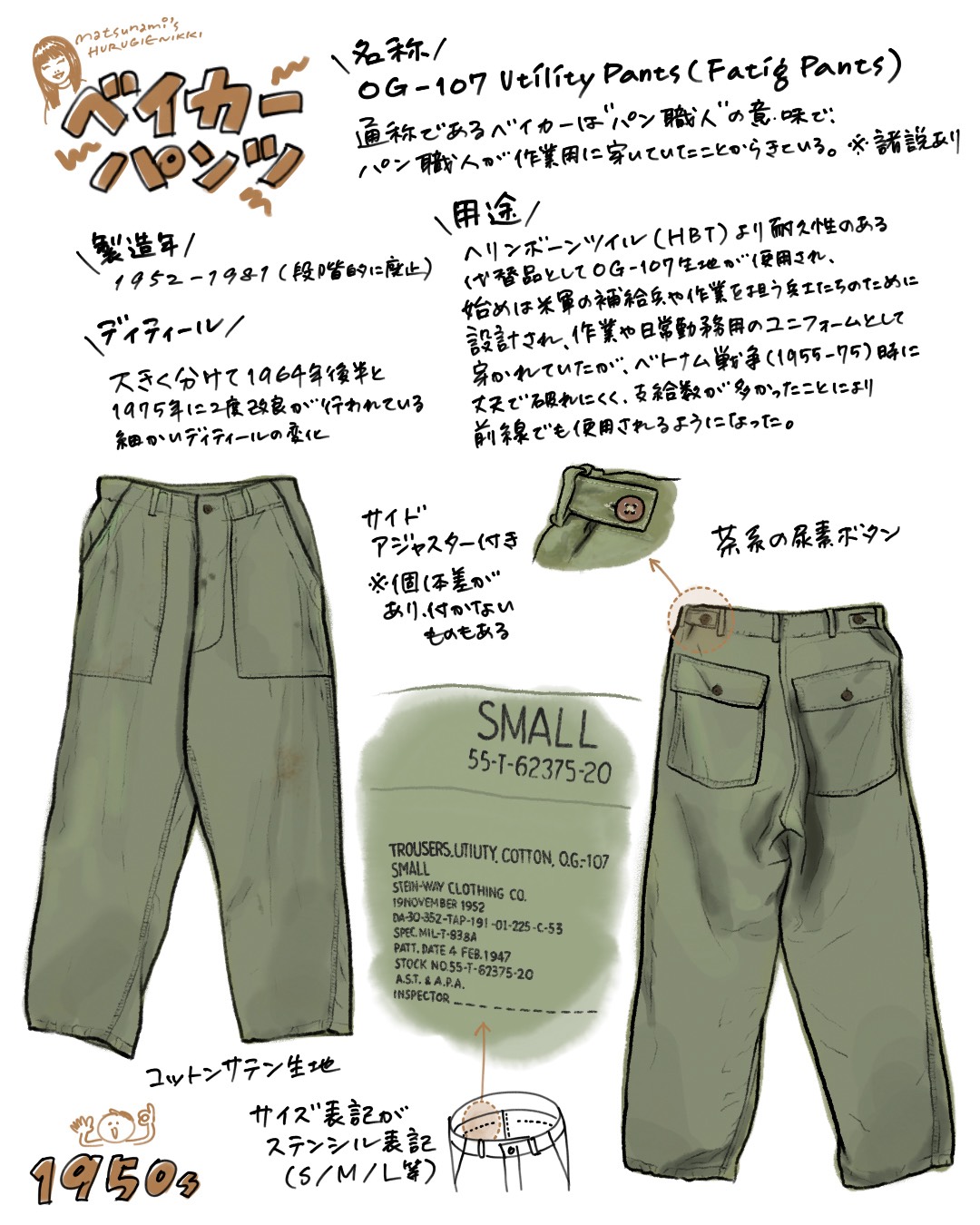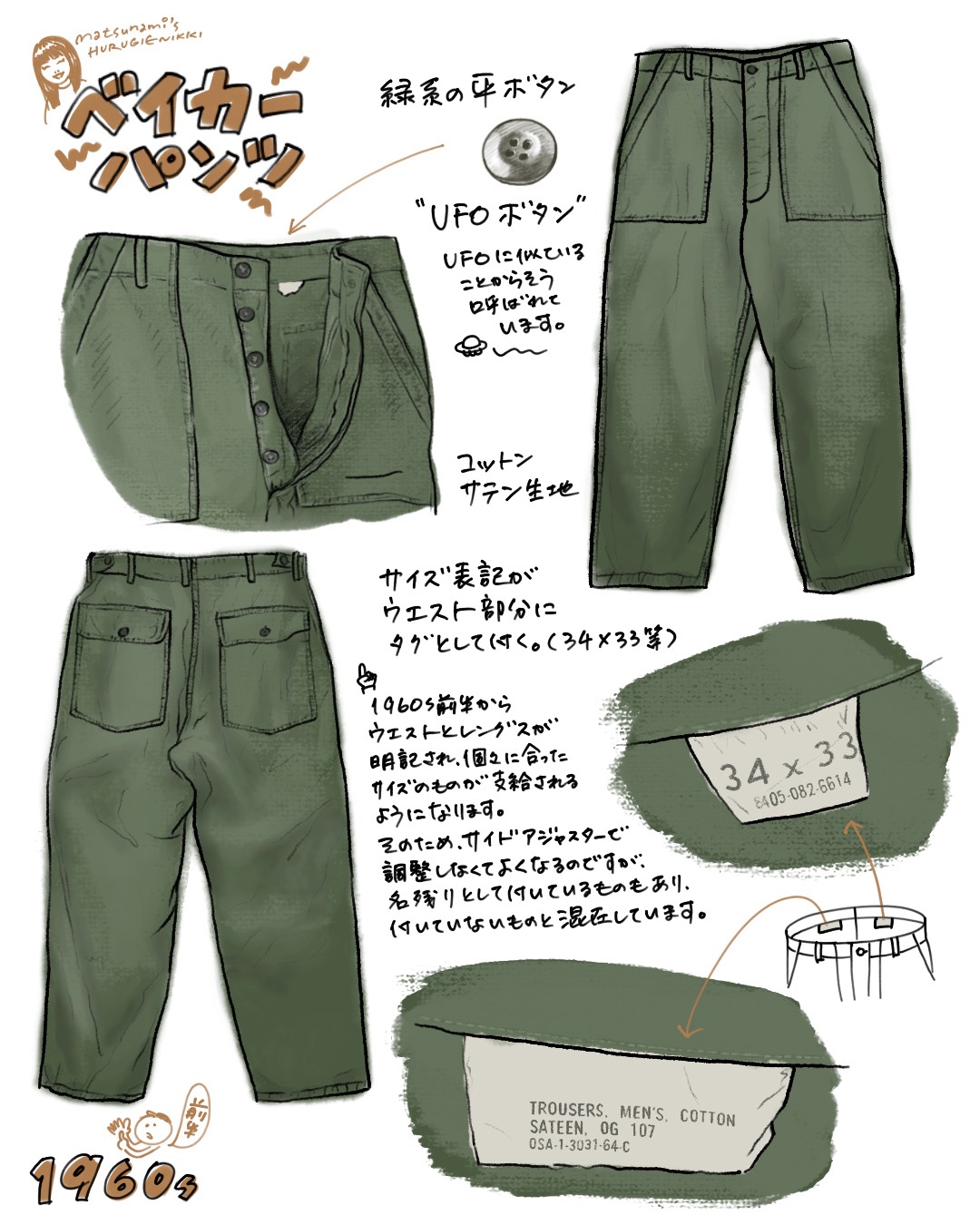 松波です:) ミリタリー絵日記編 #1 2026年03月12日 皆さん!こんにちは! 松波です! 今回は私の大好きな"ミリタリー"の絵日記編です! 私自身まだまだ勉強中ですが、ミリタリーの年代判別やディティールの判別って中々パッと見で判断つかない事も多いですよね、、! そんな時に早見表感覚で見ていただけたらと思い、ディティールの変化等をまとめてみました:) 色々ある中でも第一弾はお好きな方も多い"ベイカーパンツ"の50~60年代前半までのディティールについてです! お持ちの方は、是非見比べてみてくださいね! 次回もベイカーパンツについて深掘りしていきます! お楽しみに!! それではまた〜:) «前 次» 店員日記