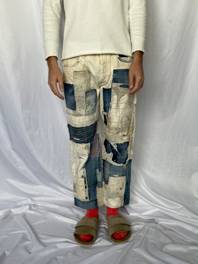 KAPITAL パッチワーク×ボロ加工 ホワイトデニムパンツ W27 [100003]