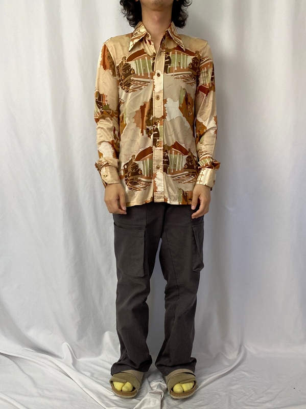 70's Hutspah 風景柄 アセテート×ナイロンシャツ L [126284]