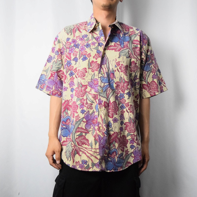 90's LANDS' END USA製 花柄 コットンシャツ L [138144]