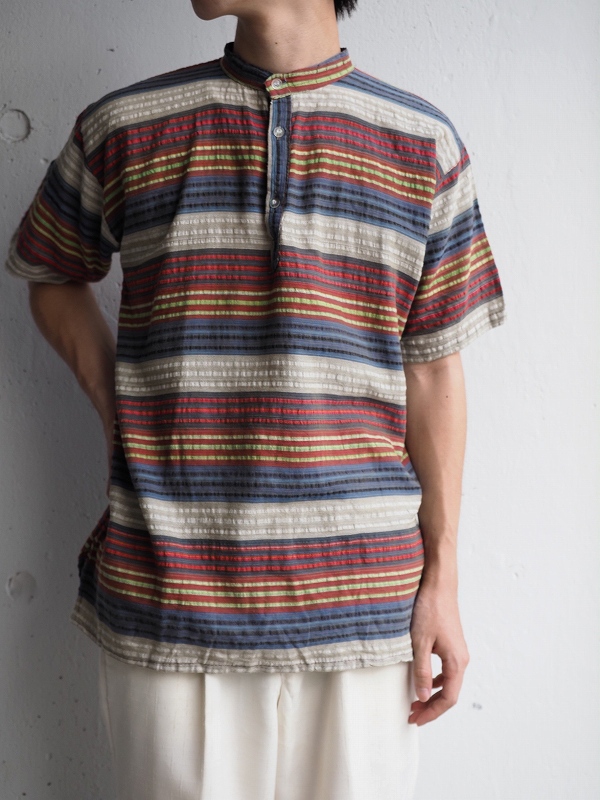 マルチボーダー柄 ヘンリーネック バンドカラーコットンシャツ [140257]