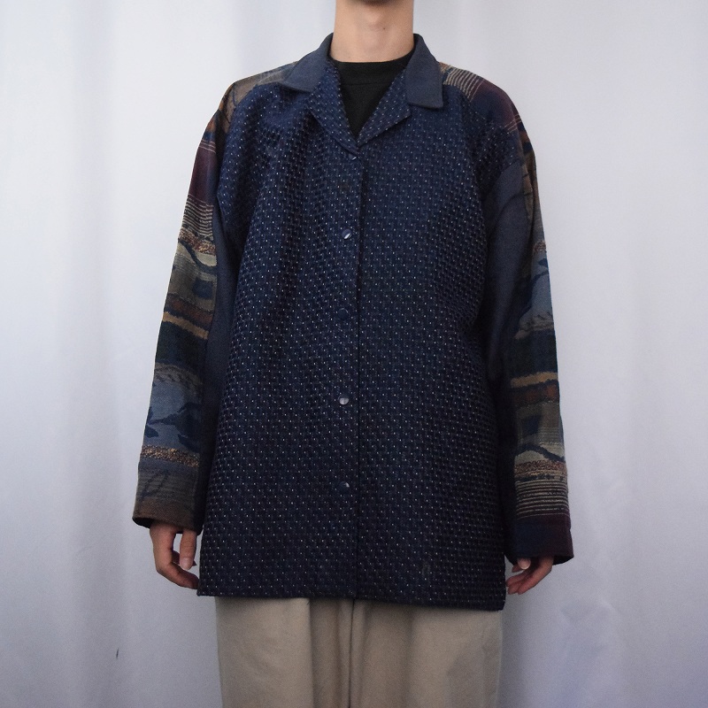 90's VILLA FACTORY 柄織り スナップボタン オープンカラーシャツ NAVY [141254]