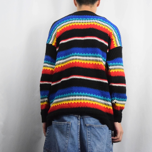 80's Cuddle Knit USA製 マルチボーダー柄 アクリルニットセーター L [142811]
