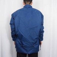 当時のアウトドアらしいアクのないブルー、表地にキルティングステッチの入らない、コートのような佇まい。2ポケットにウエストコードの付く限りなくシンプルなディテール。