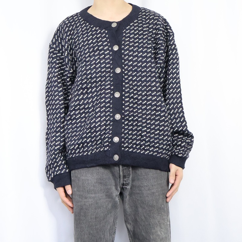 70〜80's L.L.Bean NORWAY製 バーズアイ柄 ウールニットカーディガン NAVY XL [144939]