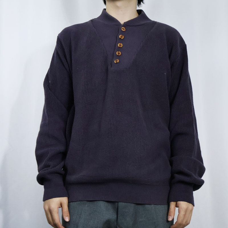 90's LANDS'END USA製 ヘンリーネック コットンニットセーター NAVY L [146833]