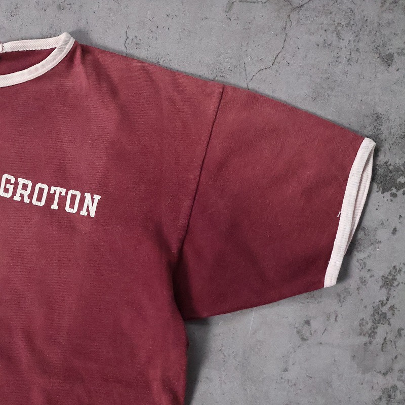 70〜80's Champion バータグ USA製 "GROTON" チョコチン プリントリンガーTシャツ L [149814]