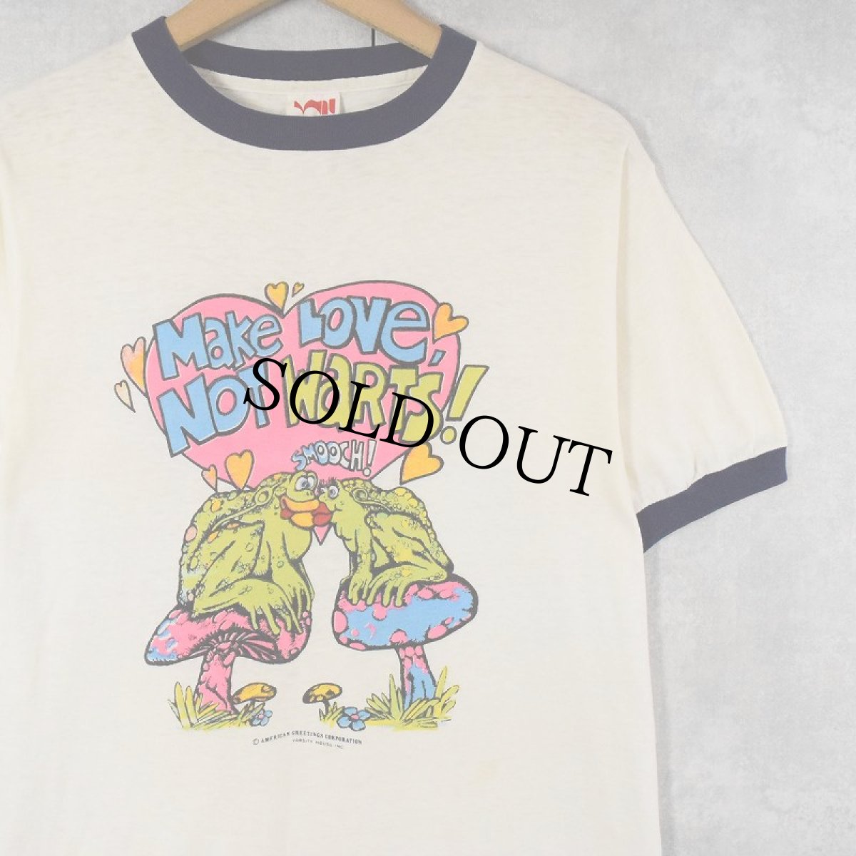 80's AMERICAN GREETINGS CORPORATION "Make Love, Not Warts!" パロディプリント リンガーTシャツ L [150050]