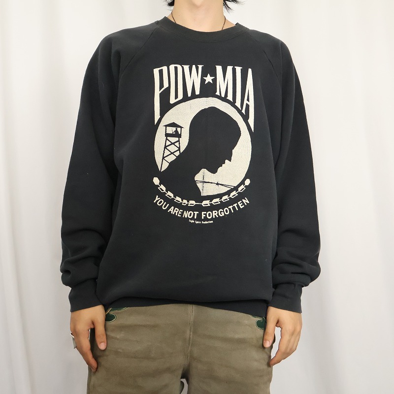 90's USA製 "POW MIA" 兵士追悼プリントラグランスウェット BLACK XL [156977]