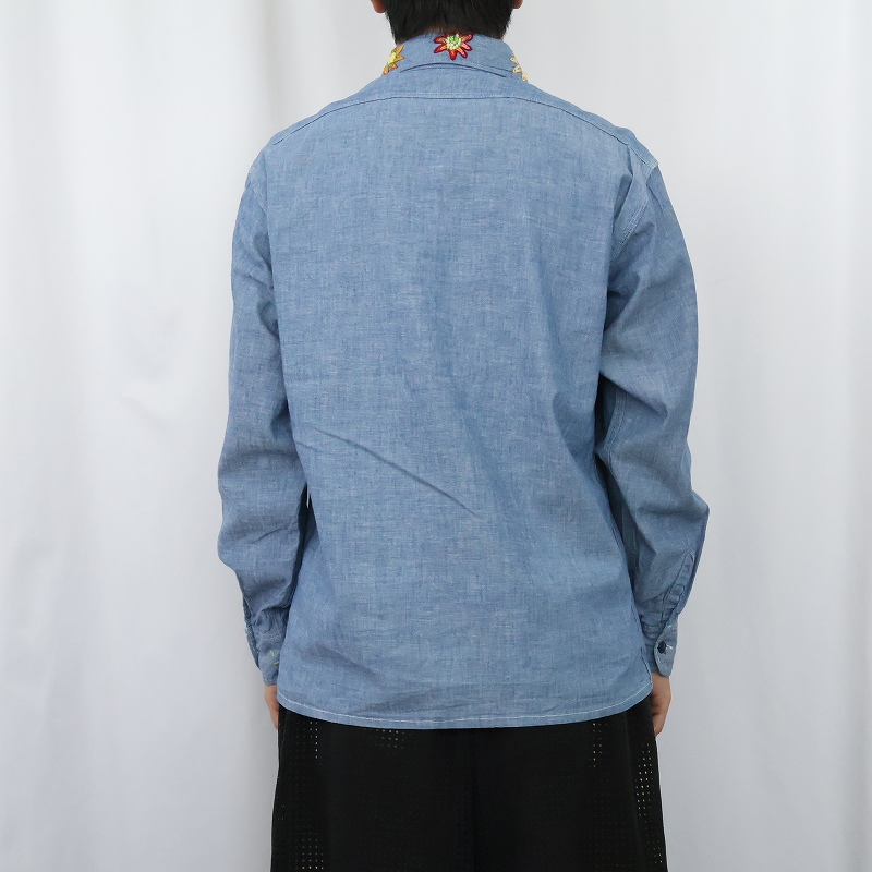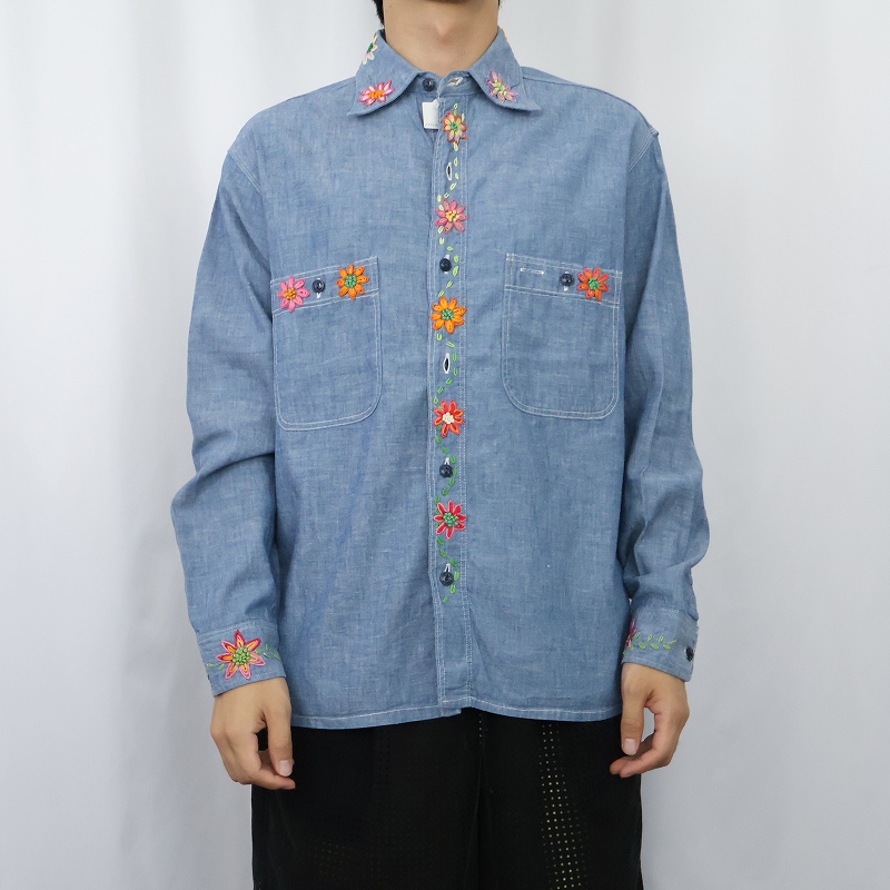 70〜80's ハンド刺繍 猫目ボタン シャンブレーシャツ M [157238]