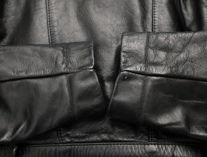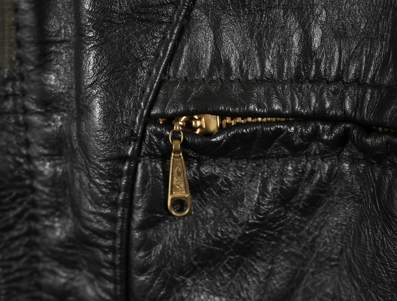 重厚なレザーの質感に、直線的な切り替えとジップの配置が無骨ながらも洗礼さを際立たせるディテール。