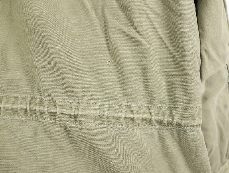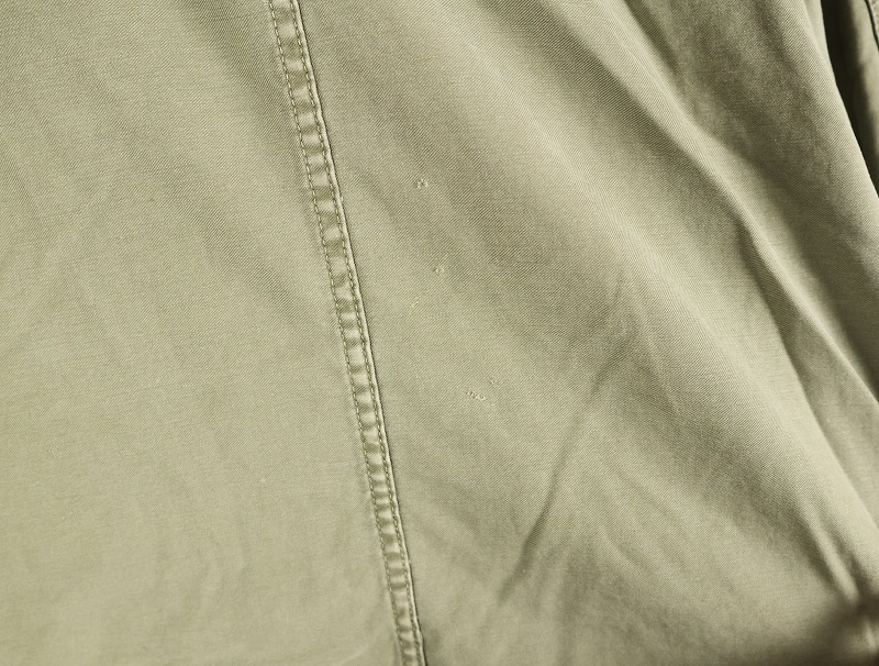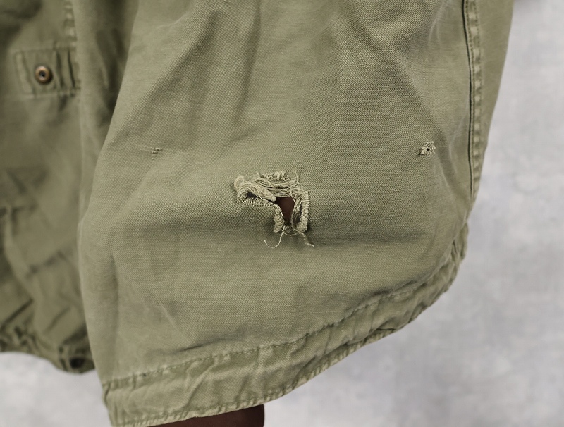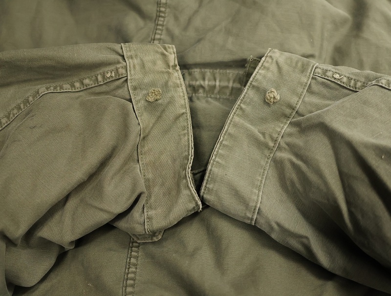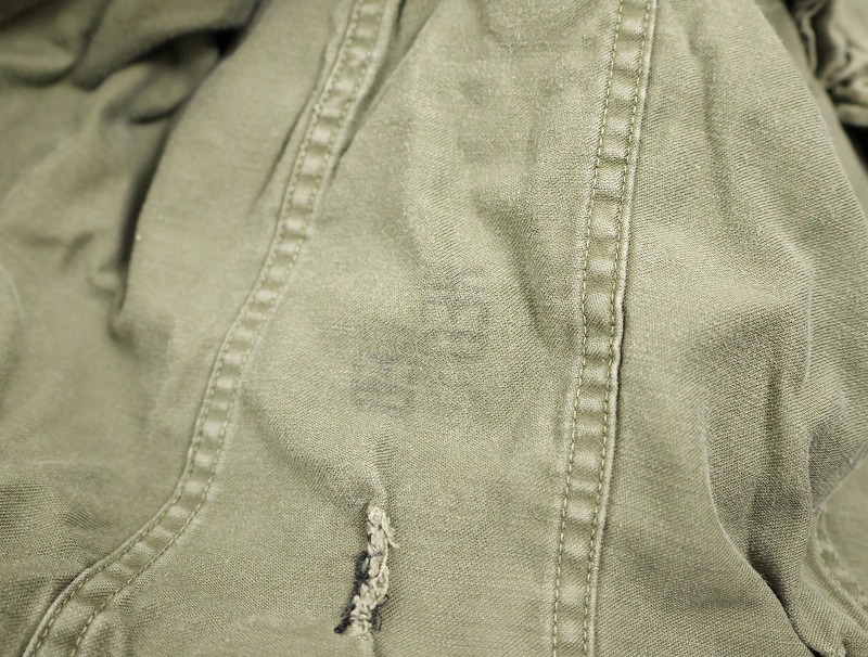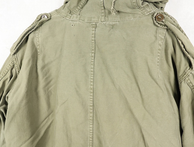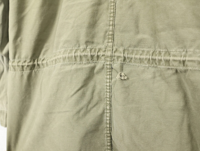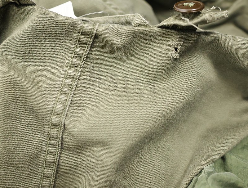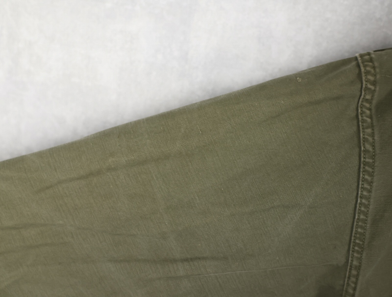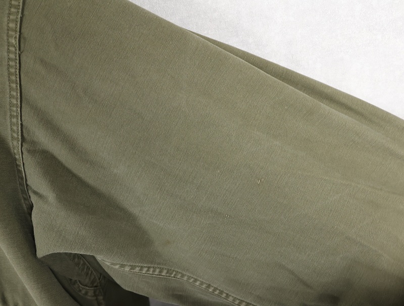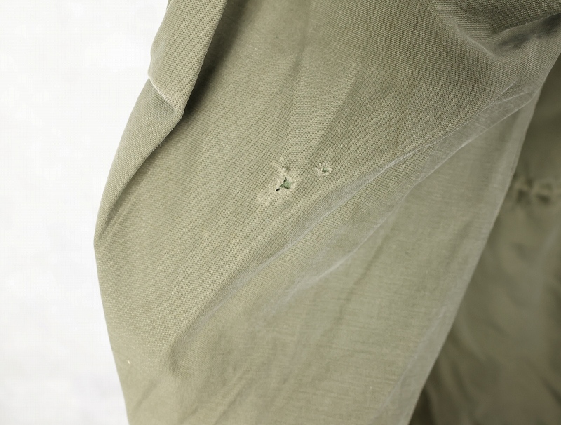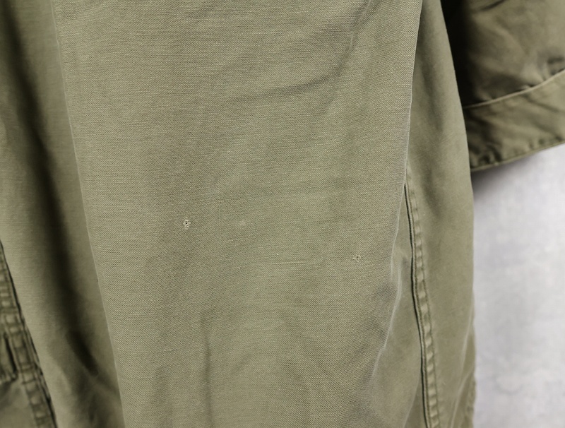 - 擦れや汚れ、穴などのダメージ、首後ろ付近にリペア跡があります。また、袖口のボタンが欠損していますが、とても雰囲気の良い一点です。