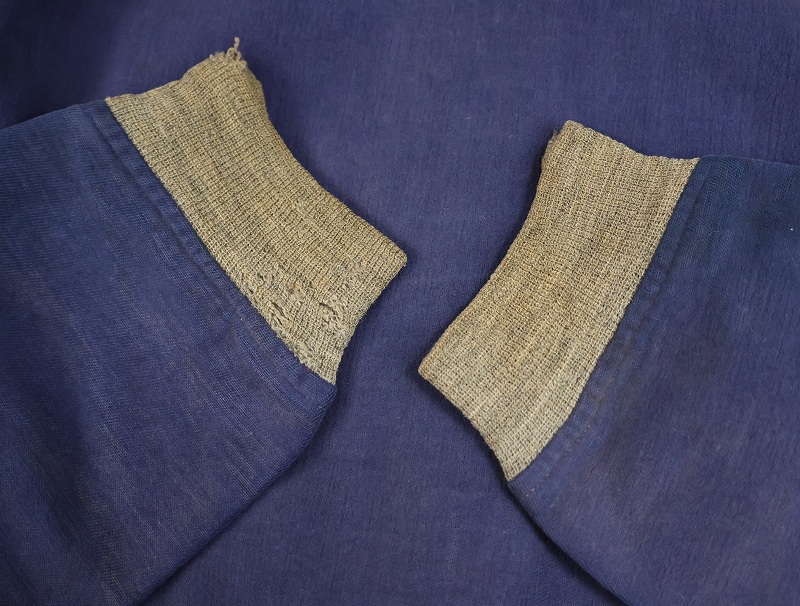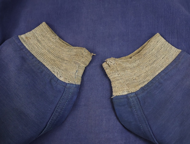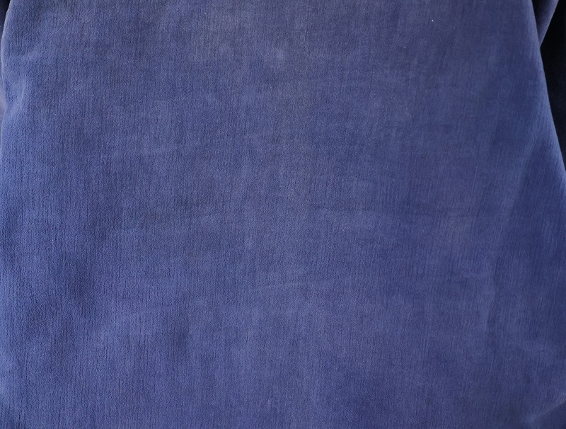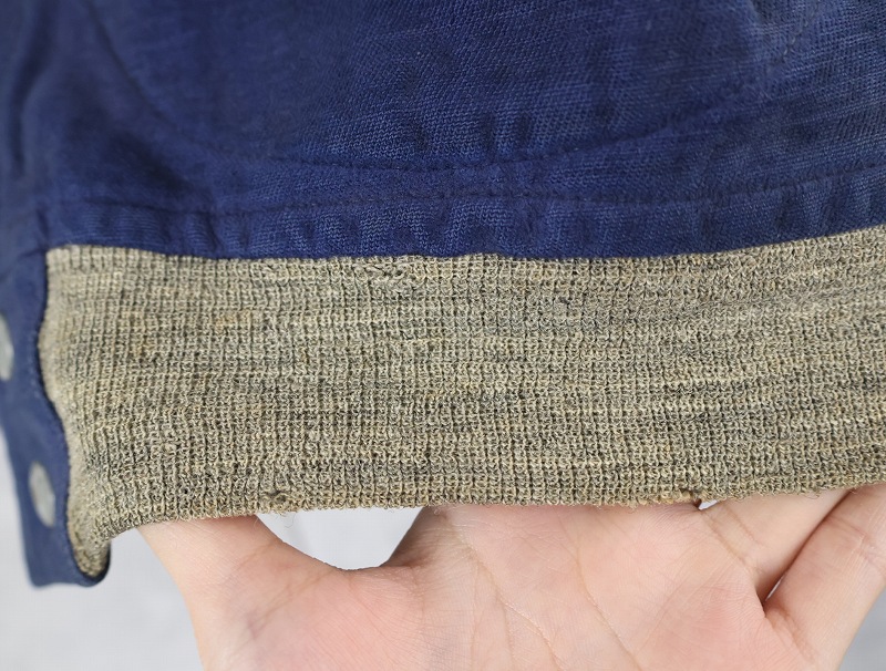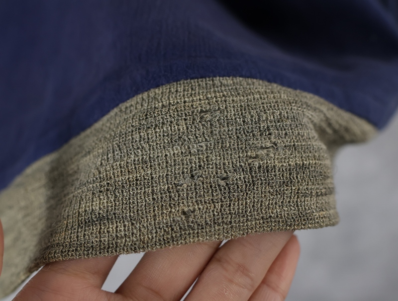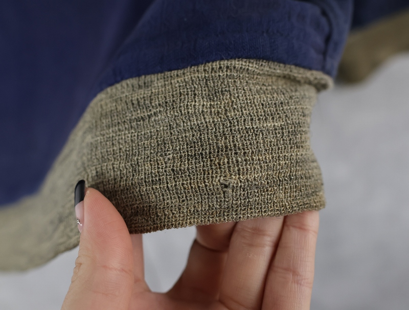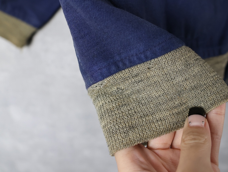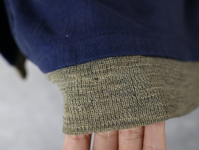 2トーンの切り替えは、肌触りの良いピーチスキンのブルーに、リブは乾いたウールのグレーのカラーリング。