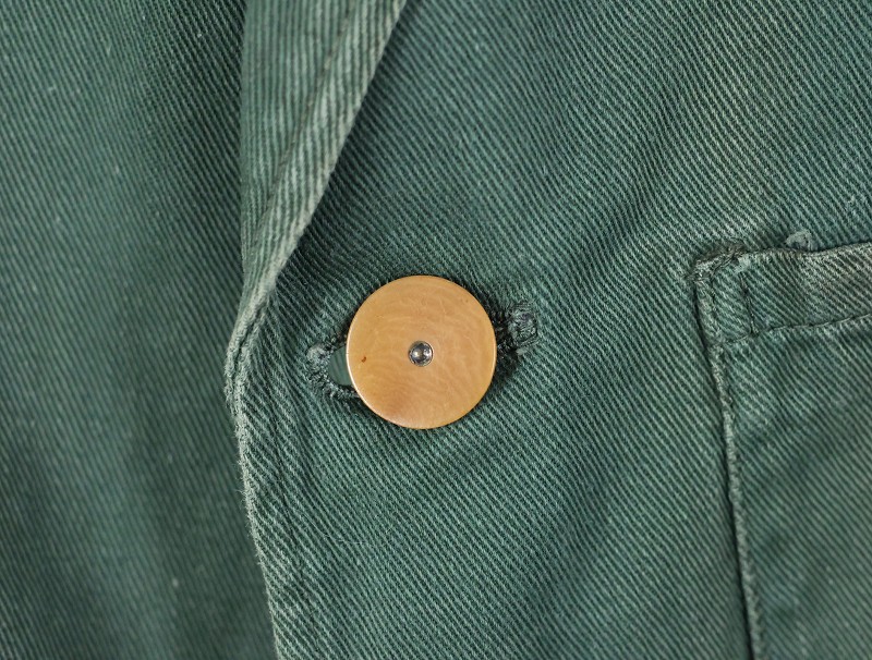 ラペルと袖口の2トーン切り替え、ベークライトを用いた3連のチェンジボタン、随所からブリティッシュの品性が窺える1点。