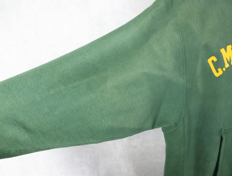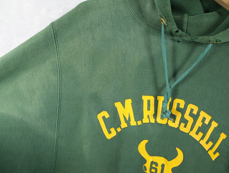 70〜80's Champion 青単色タグ REVERSE WEAVE USA製 "C.M.RUSSELL" カットオフ プリントスウェットフーディー M [161301]