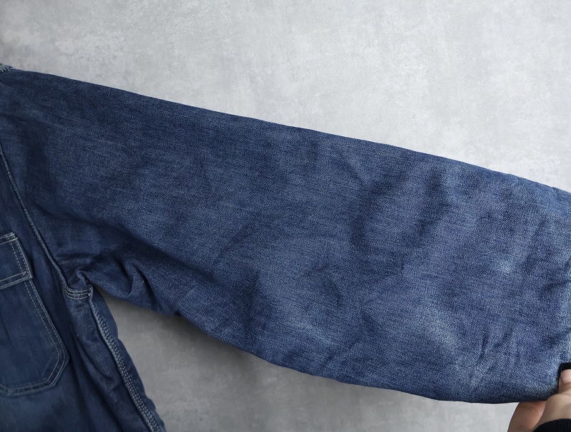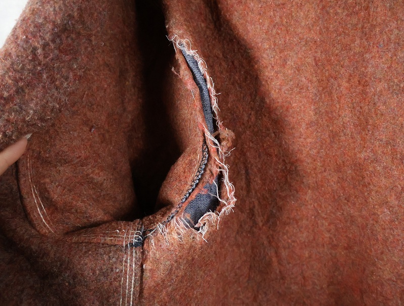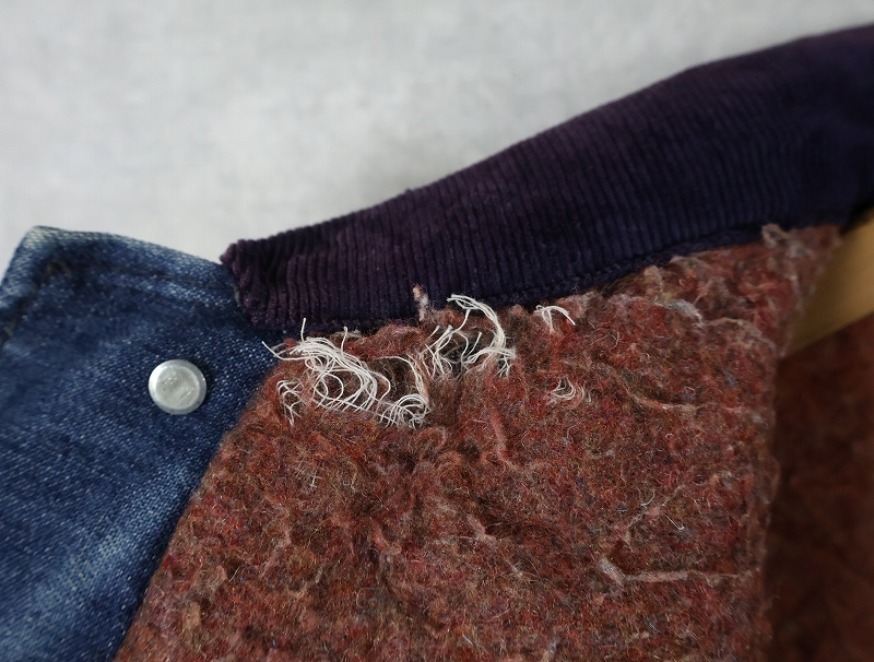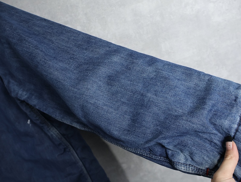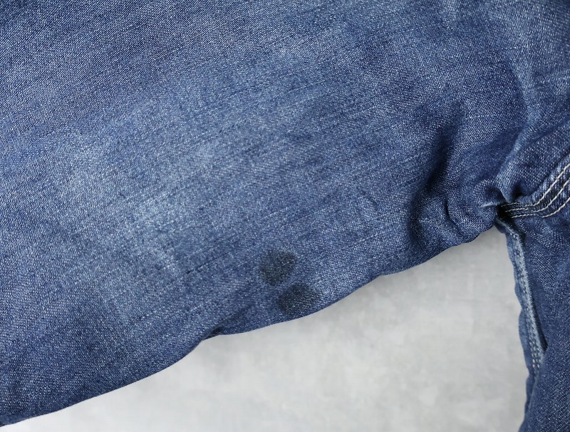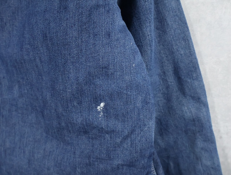 - 色落ち、シミ、黄ばみ、裏地とポケットに破れがありますが、とても雰囲気の良い一点です。
