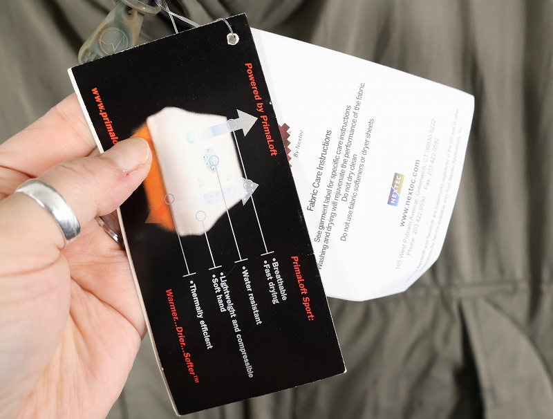 中綿はダウンの8倍もの性能を持つと言われるマイクロファイバー素材''PRIMALOFT''を併せ持ちます。
