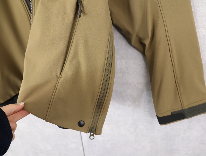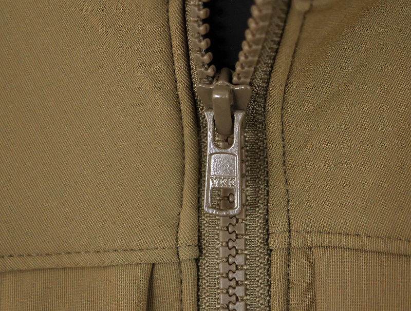身頃からウエストにかけてほどよいフィット感を感じれるボックスシルエットはガンマやブラボージャケットに近い型と言えます。 両サイドにはスナップボタンとファスナーが付き、ウエストの締め付けを調整することも可能です。