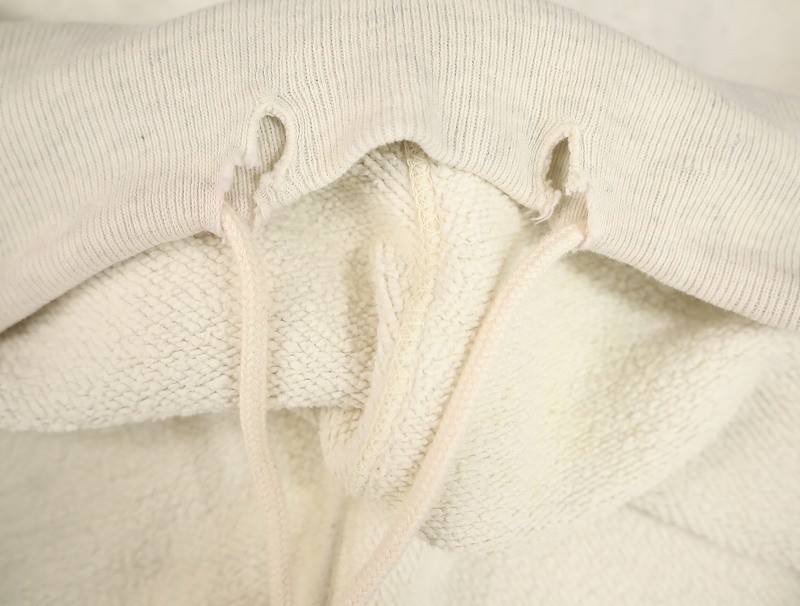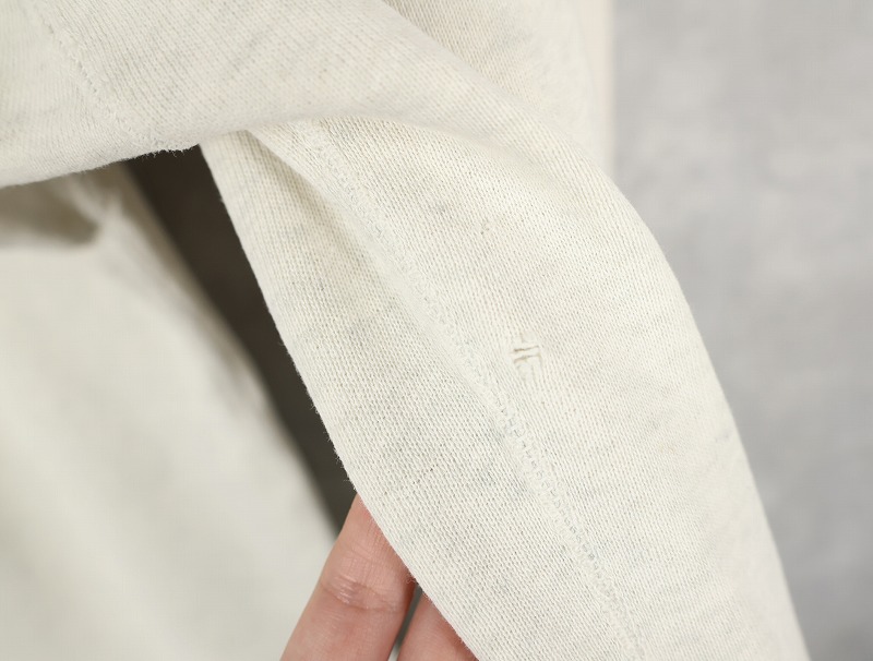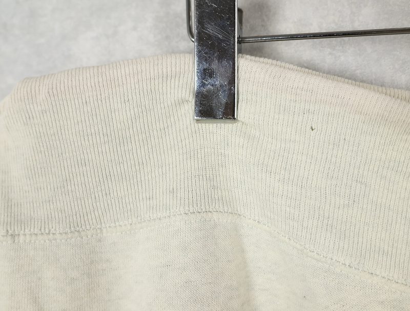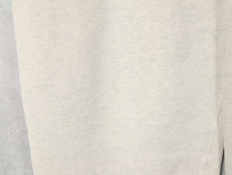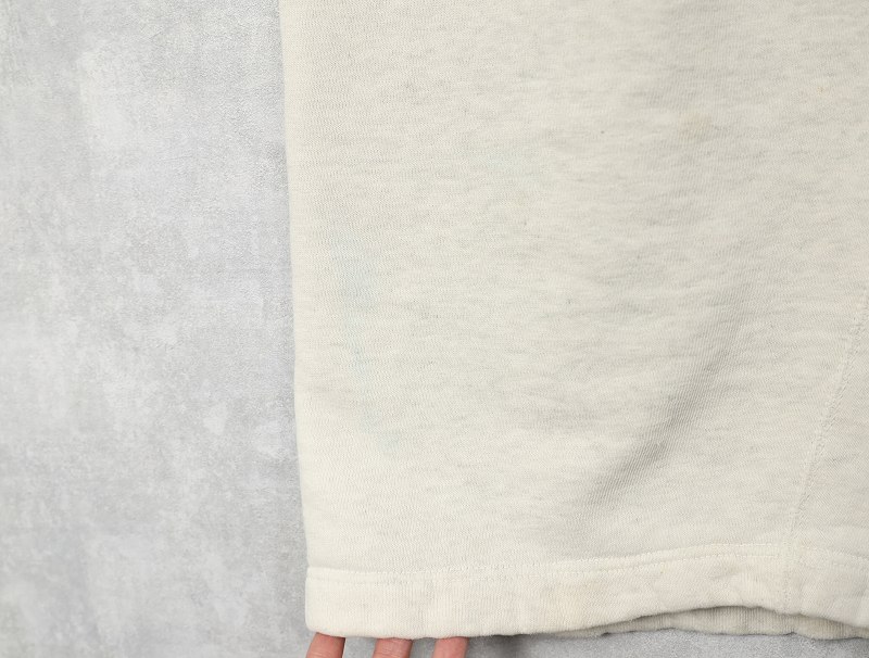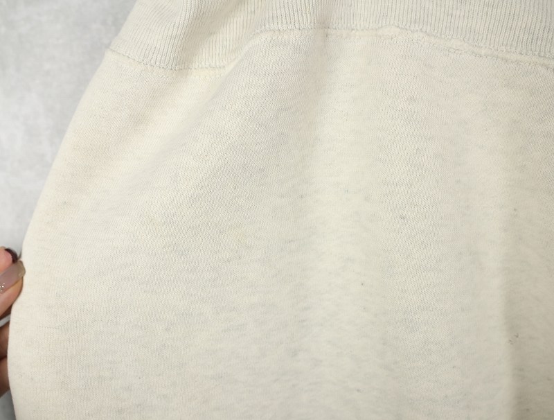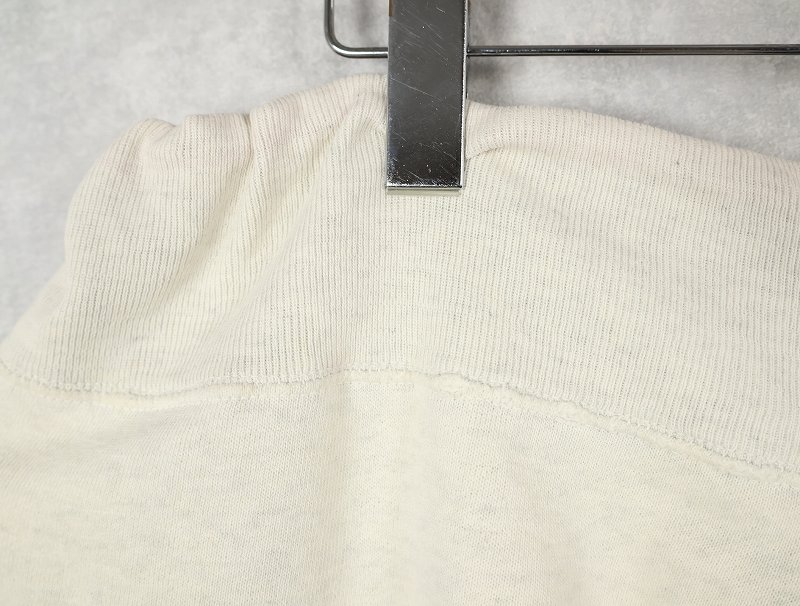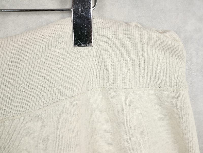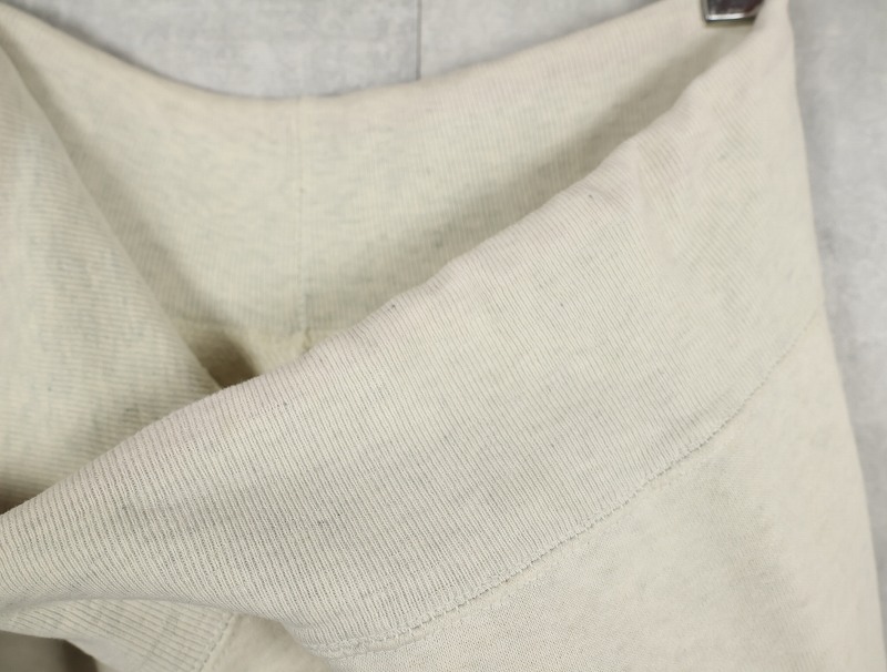 素材は中肉のスウェット地。オフホワイトに杢が見え隠れするビンテージスウェットらしい風合いを持ったモデルです。