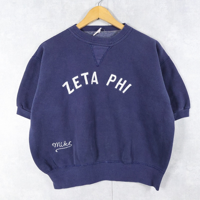 50〜60's USA製 "ZETA PHI" チェーン刺繍 前V 半袖スウェット NAVY L [163950]