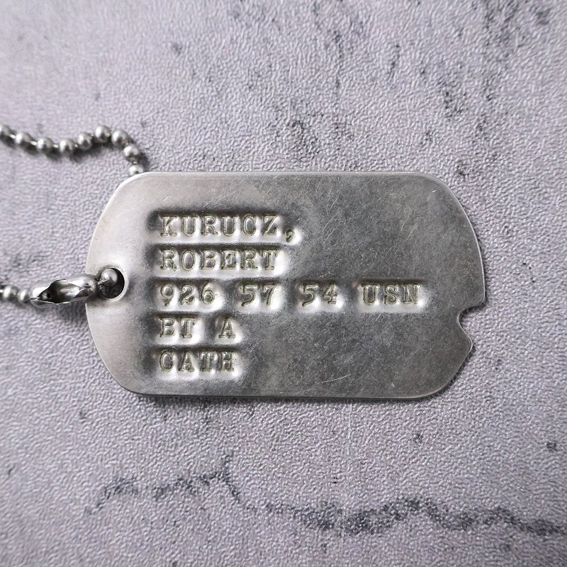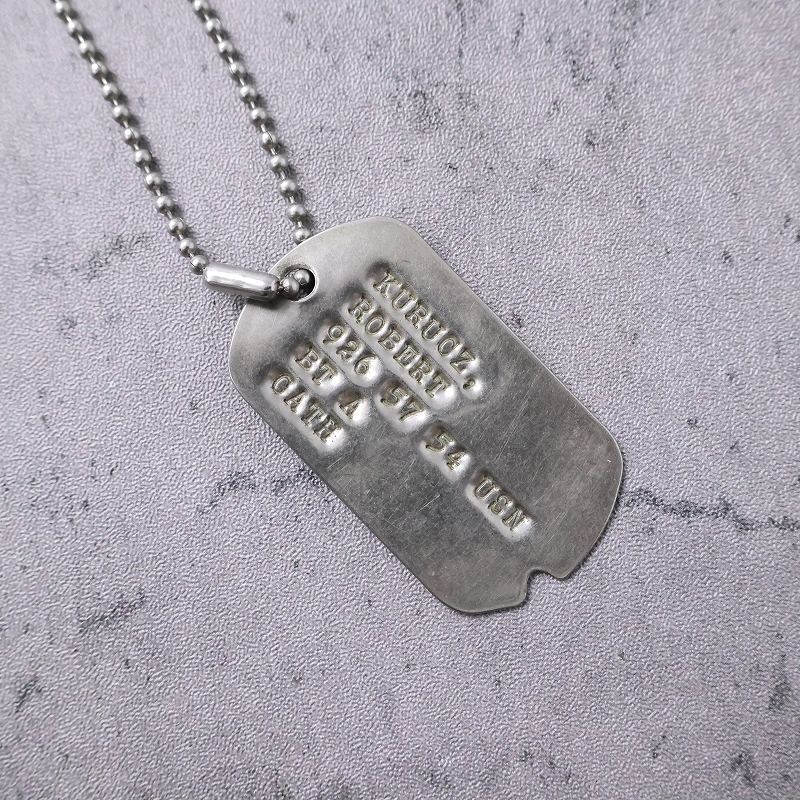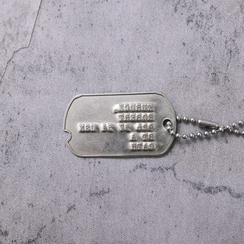 名前や血液型が刻印された無骨なデザインは、スウェットやTシャツ、デニムなどラフなスタイルと好相性です。