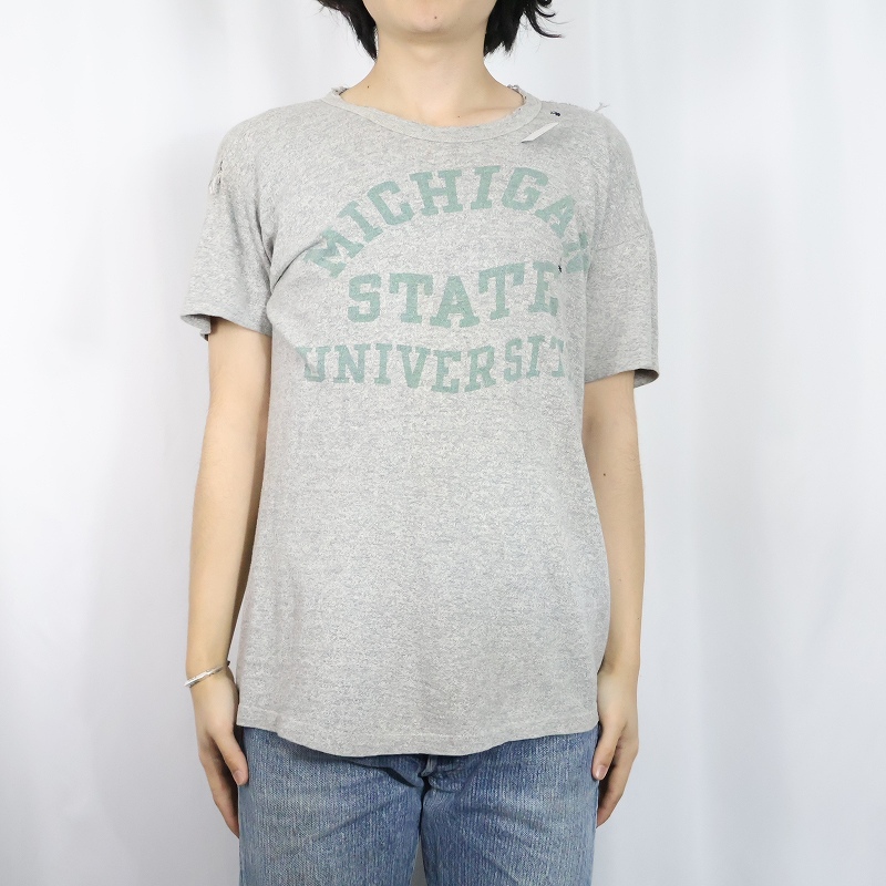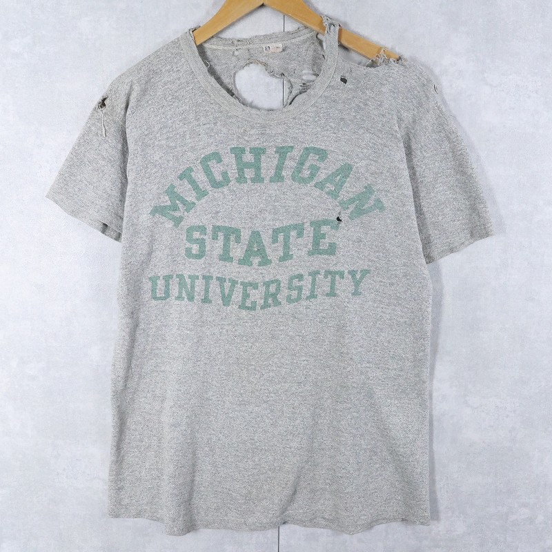 60's Champion 大文字ランタグ USA製 "MICHIGAN STATE UNIVERSITY" 染み込みプリントTシャツ SIZE44 [164248]