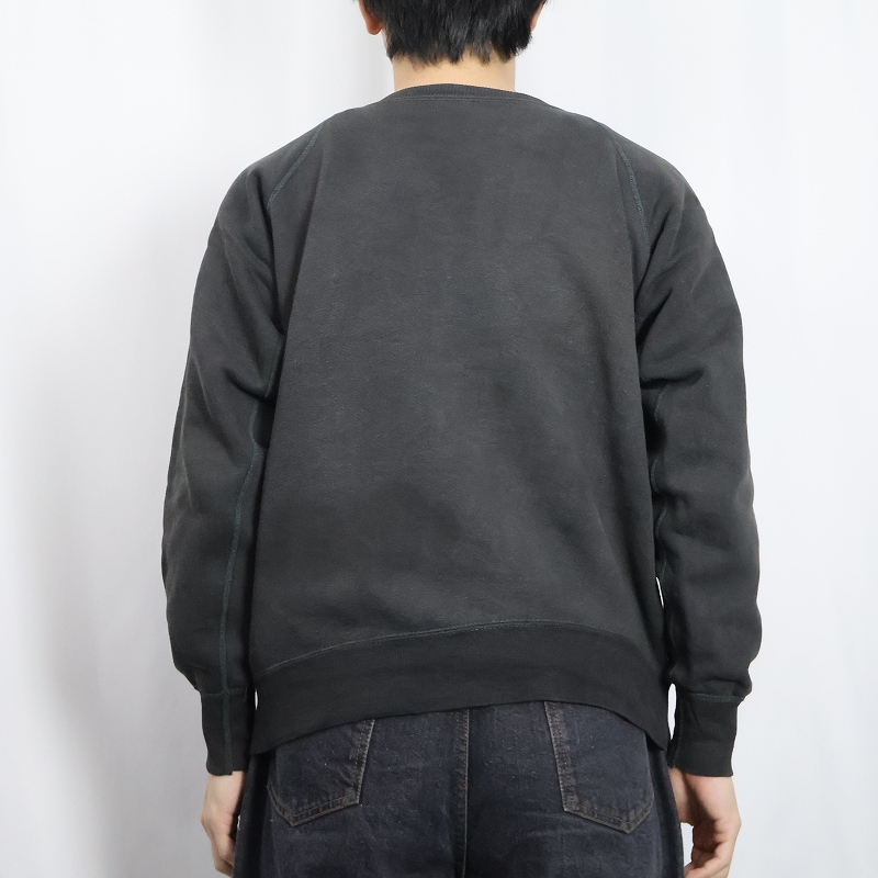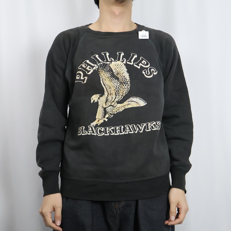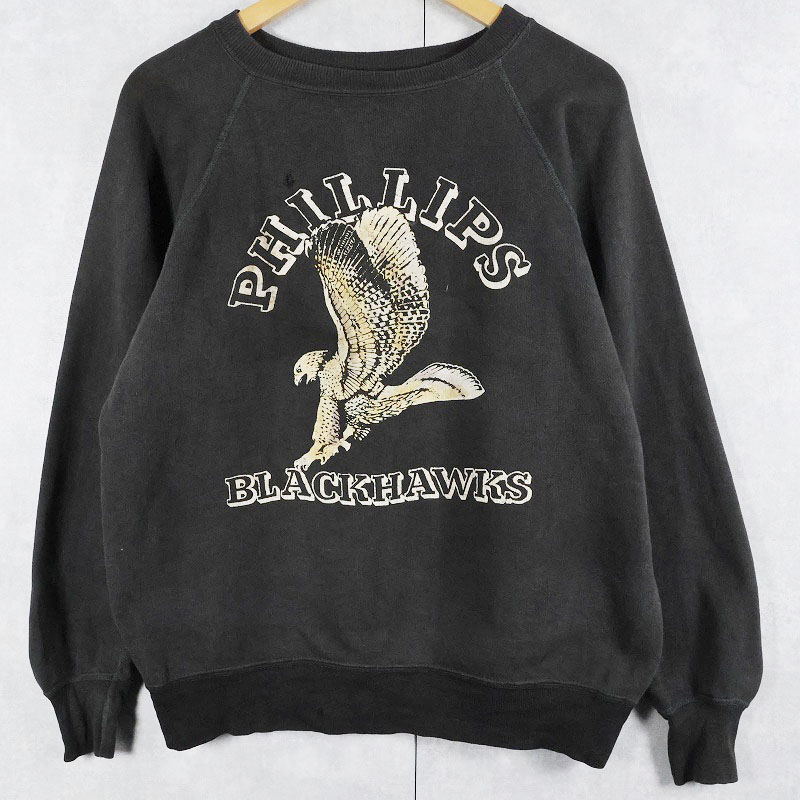 60's "PHILLIPS BLACKHAWKS" 脇下三角ガゼット カラーフロッキープリントラグランスウェット BLACK [164819]