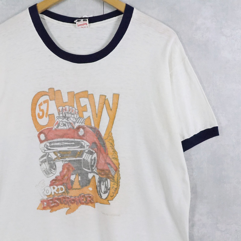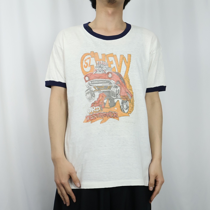 60〜70's FORD DESTROYER 染み込みプリント リンガーTシャツ L [165263]