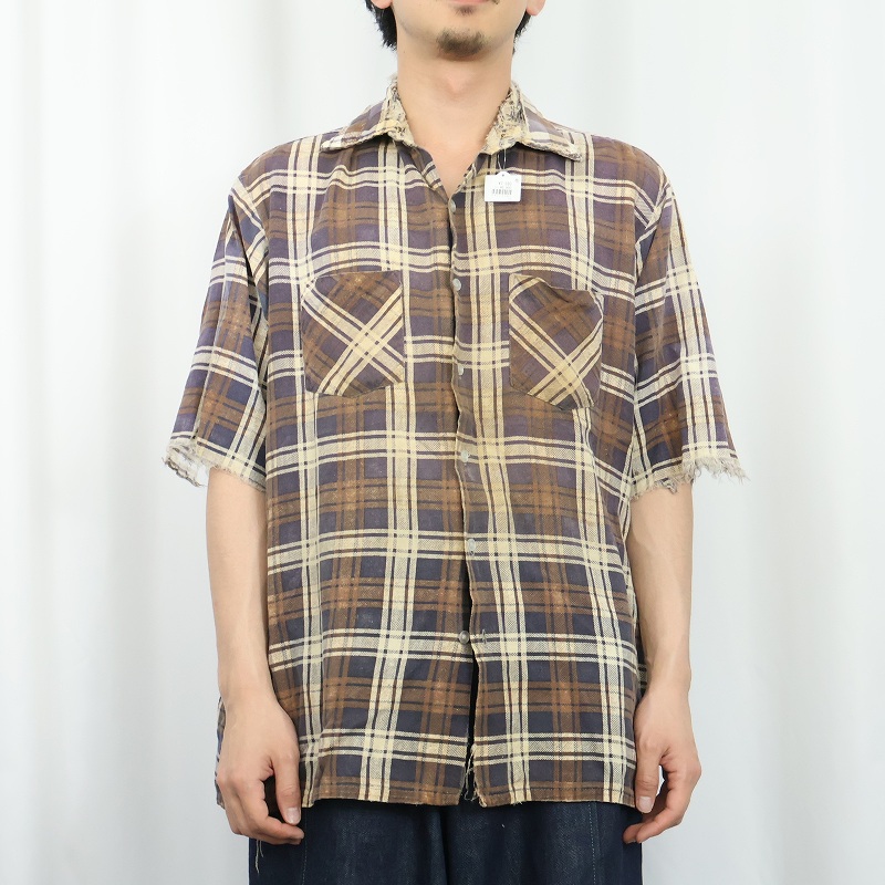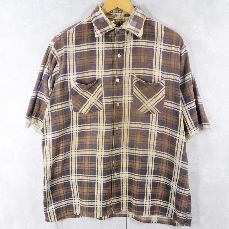 70〜80's KINGSPORT チェック柄 カットオフスリーブ プリントネルシャツ L [166841]