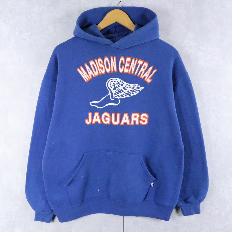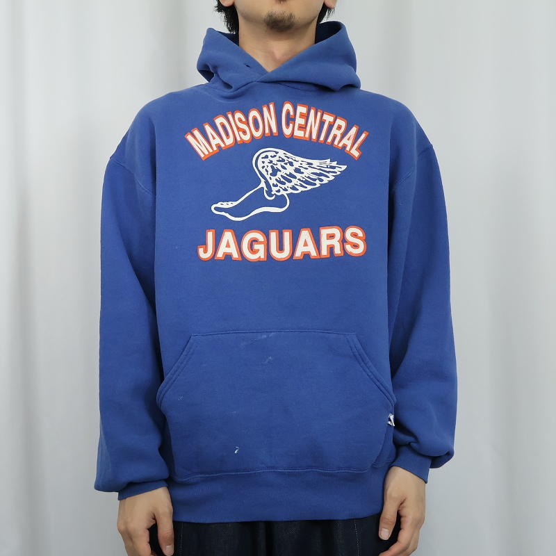 90's RUSSELL ATHLETIC USA製 "MADISON CENTRAL JAGUARS" ウイングフットプリントスウェットフーディー L [166874]