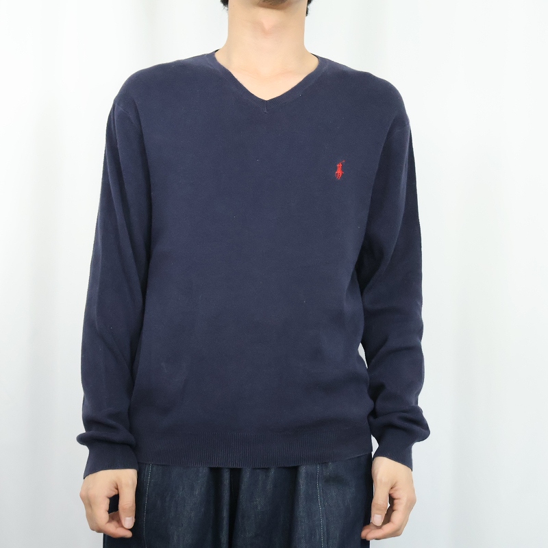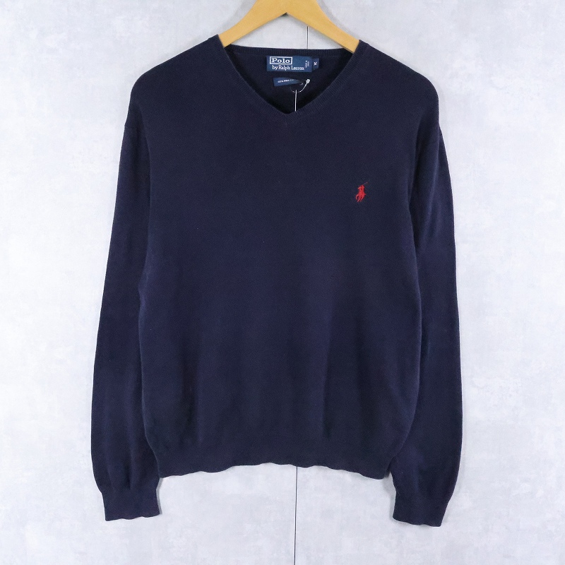 POLO Ralph Lauren ロゴ刺繍 "PIMA COTTON" Vネック コットンニットセーター NAVY M [166886]