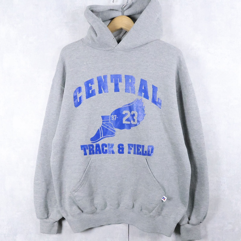 90's RUSSELL ATHLETIC USA製 "CENTRAL TRACK & FIELD" ウィングフットプリントスウェットフーディー L [167643]
