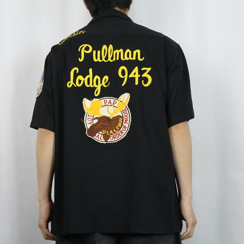 50's Holiday "Pullman Lodge 94" チェーン刺繍×ワッペン付き レーヨンボウリングシャツ BLACK L [168221]