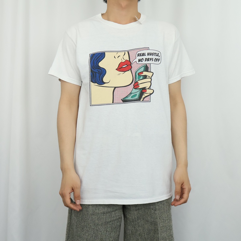 "REAL HUSTLE, NO DAYS OFF" リキテン風 ポップアートプリントTシャツ [168250]