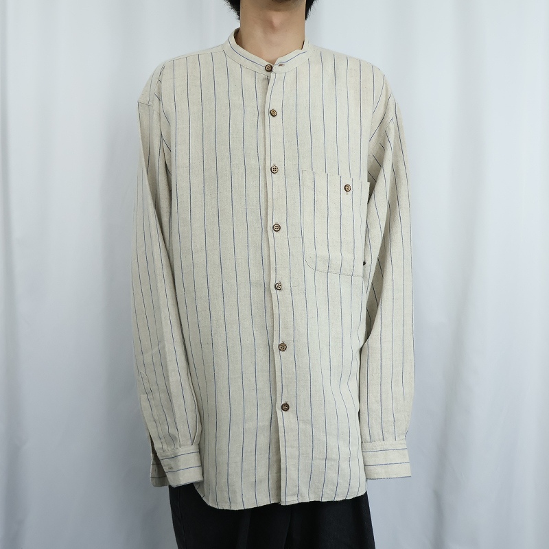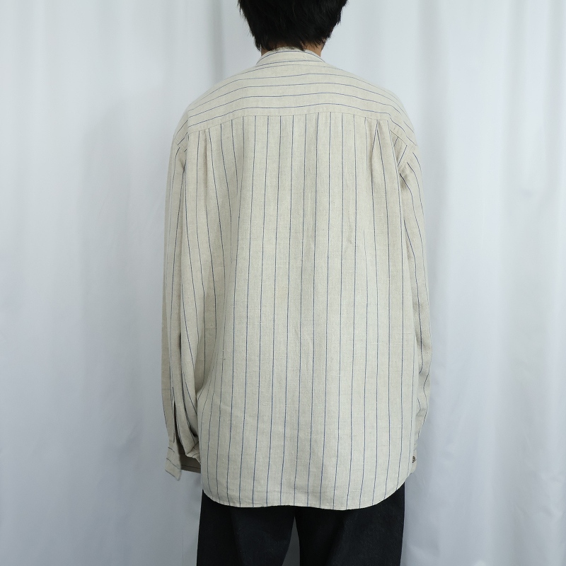 PIERRE VEDUN ストライプ柄 バンドカラーリネンシャツ L [168299]