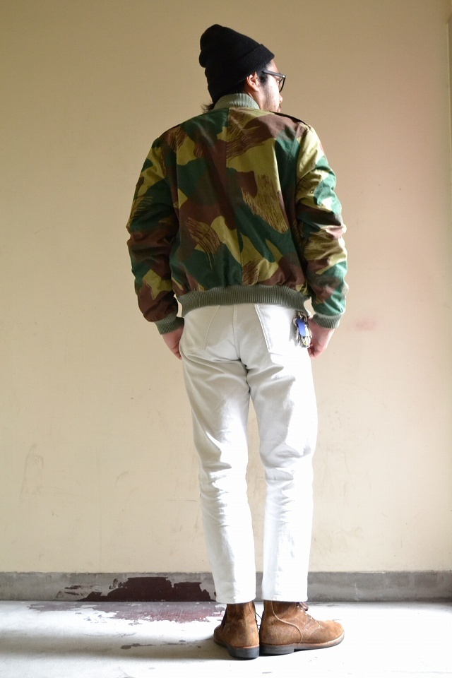 - ローデシア迷彩。ローデシアとはザンビア・ジンバブエを合わせた地域の名称。 1965年から1979年にかけてのジンバブエを実質支配していた白人政権が用いた名称です。即ちこちらも年代としてはその頃に相当する一品となります。 この時代はローデシア紛争(1965 - 1980)が勃発しており、南アフリカ防衛軍(South African Defence Force)と共に、ローデシア国内および近隣諸国での戦闘活動で使用された一品です。こちらの迷彩をご覧いただき、EURO迷彩にお詳しい方ならば思い当たるのが40年代イギリス軍のエリートたちに支給されていたSASカモではないでしょうか。こちらはそのSASカモにブラシで書きなぐったような特徴があります。ジャケット全体の作り、またRAFにも似た胸章からもご察しの通りパイロットJK 迷彩のパイロットJKなのです。戦闘では使用されなかったものと思われます。